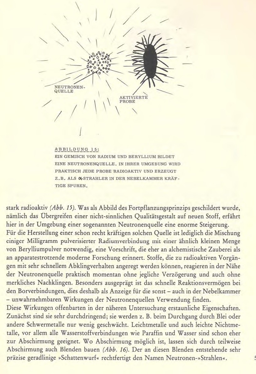stark radioaktiv (Abb.15). Was als Abbild des Fortpflanzungsprinzips geschildert wurde, nämlich das Ubergreifen einer nicht-sinnlichen Qualitätsgestalt auf neuen Stoff, erfährt hier in der Umgebung einer sogenannten Neutronenquelle eine enorme Steigerung.