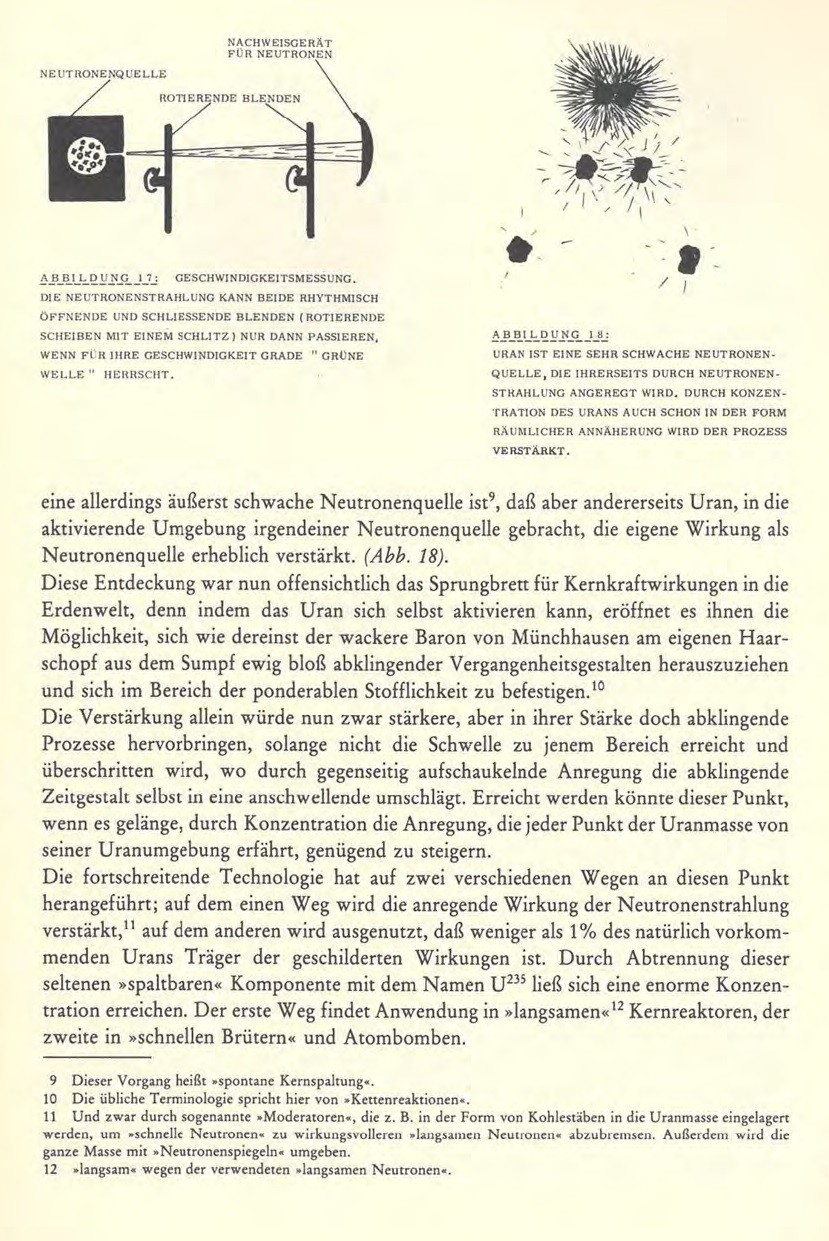 Diese Entdeckung war nun offensichtlich das Sprungbrett für Kernkraftwirkungen in die Erdenwelt, denn indem das Uran sich selbst aktivieren kann, eröffnet es ihnen die Möglichkeit, sich wie dereinst der wackere Baron von Münchhausen am eigenen Haarschopf aus dem Sumpf ewig bloß abklingender Vergangenheitsgestalten herauszuziehen und sich im Bereich der ponderablen Stofflichkeit zu befestigen. (10 Die übliche Terminologie spricht hier von <<Kettenreaktionen>>).